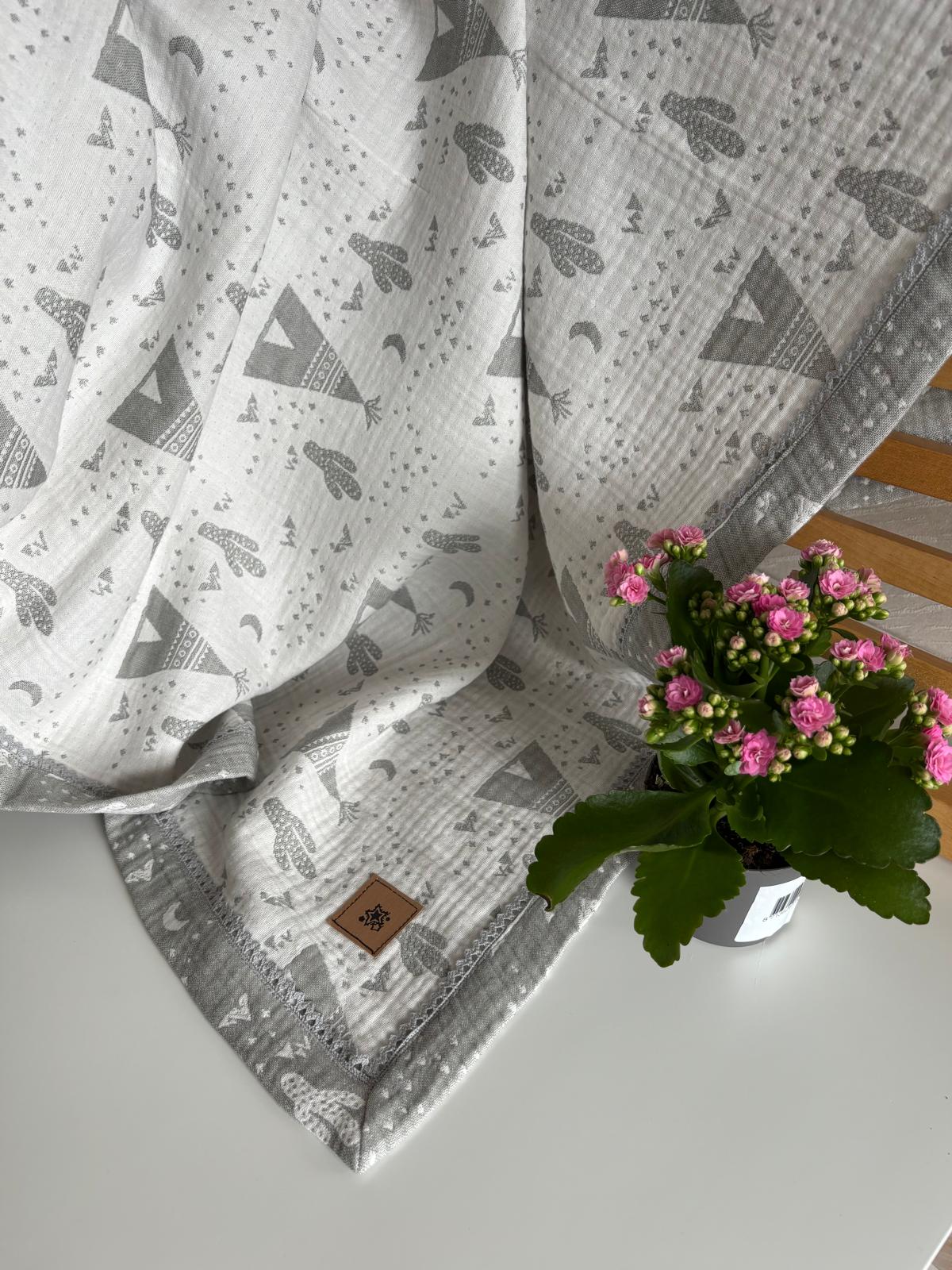 Tillverkad av 4-lagers muslin. Med måtten 100 x 100 cm passar filten perfekt i vagnen, spjälsängen eller som en mysig snuttefilt under vilostunden. (Generellt sett är storlekarna större.)