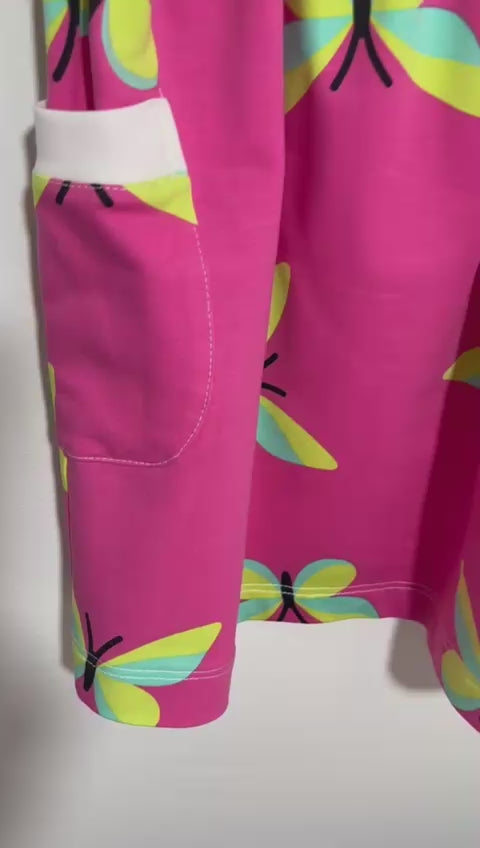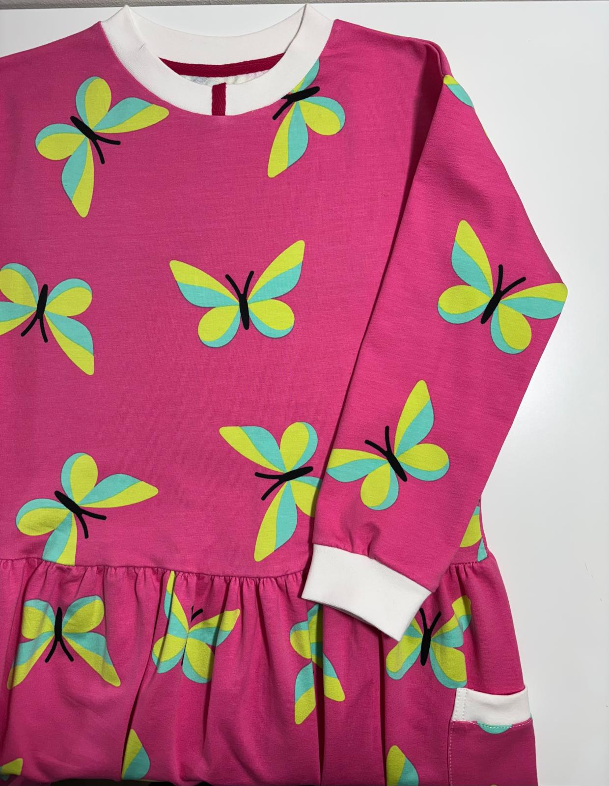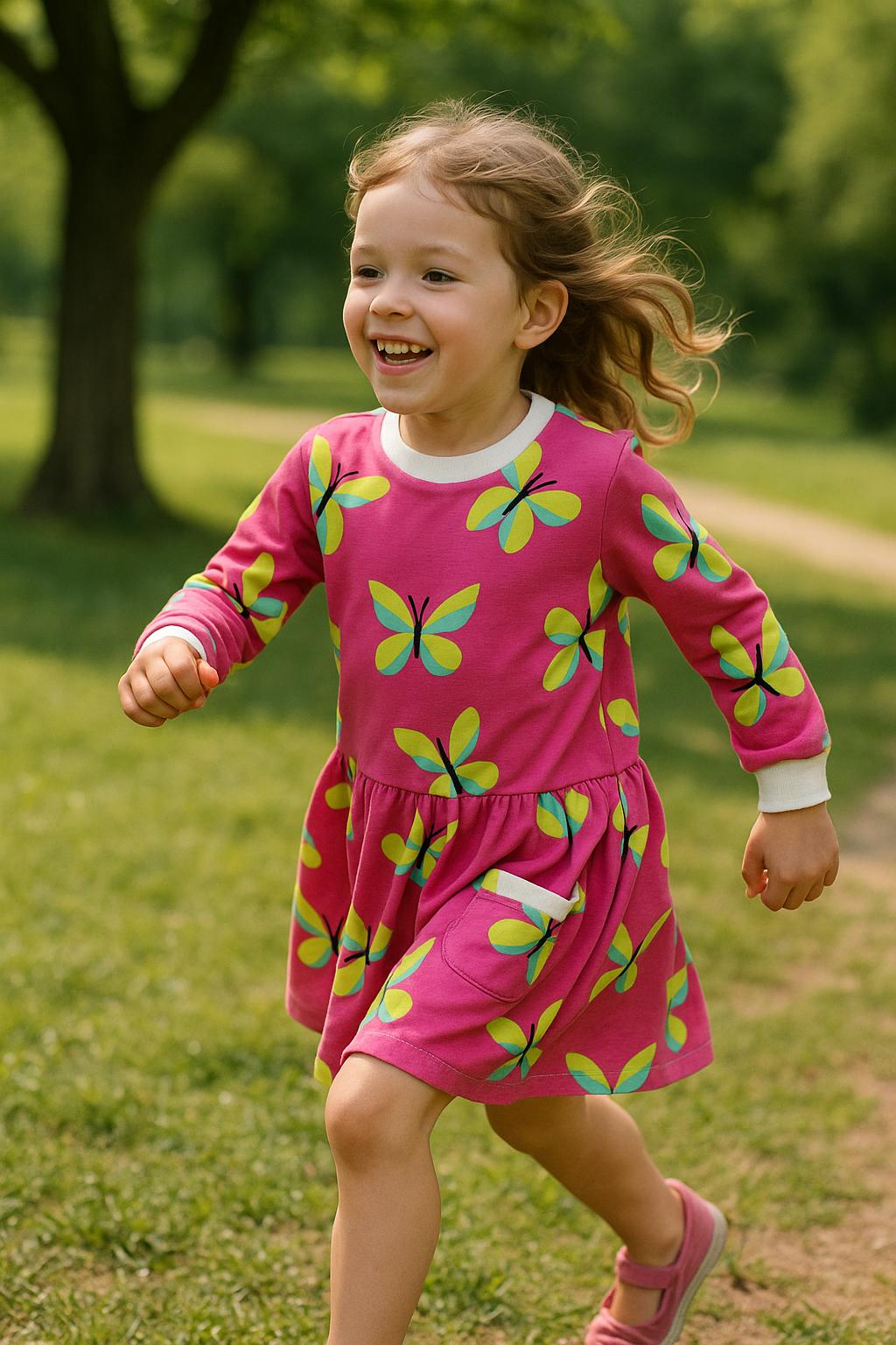 Denna vackra långärmade klänning är handsydd i mjuk bomullsjersey, perfekt för känslig hud. Det färgstarka blommönstret i lila, rosa, blått och orange gör varje dag lite gladare. Praktiska sidofickor och en snurrvänlig kjol gör den perfekt för både lek och fest.