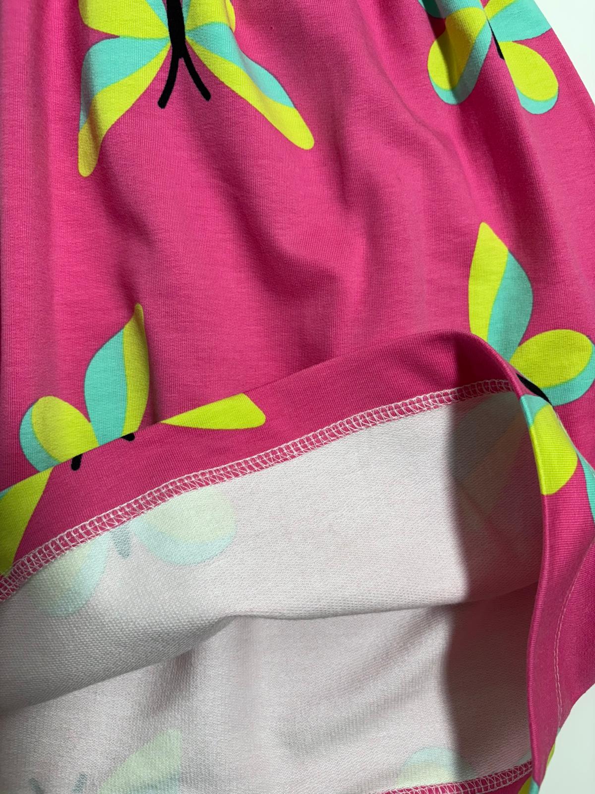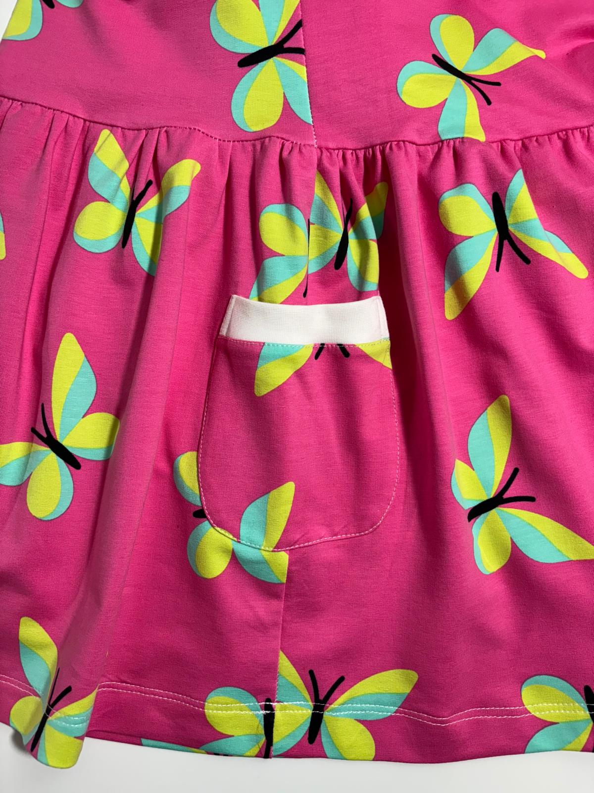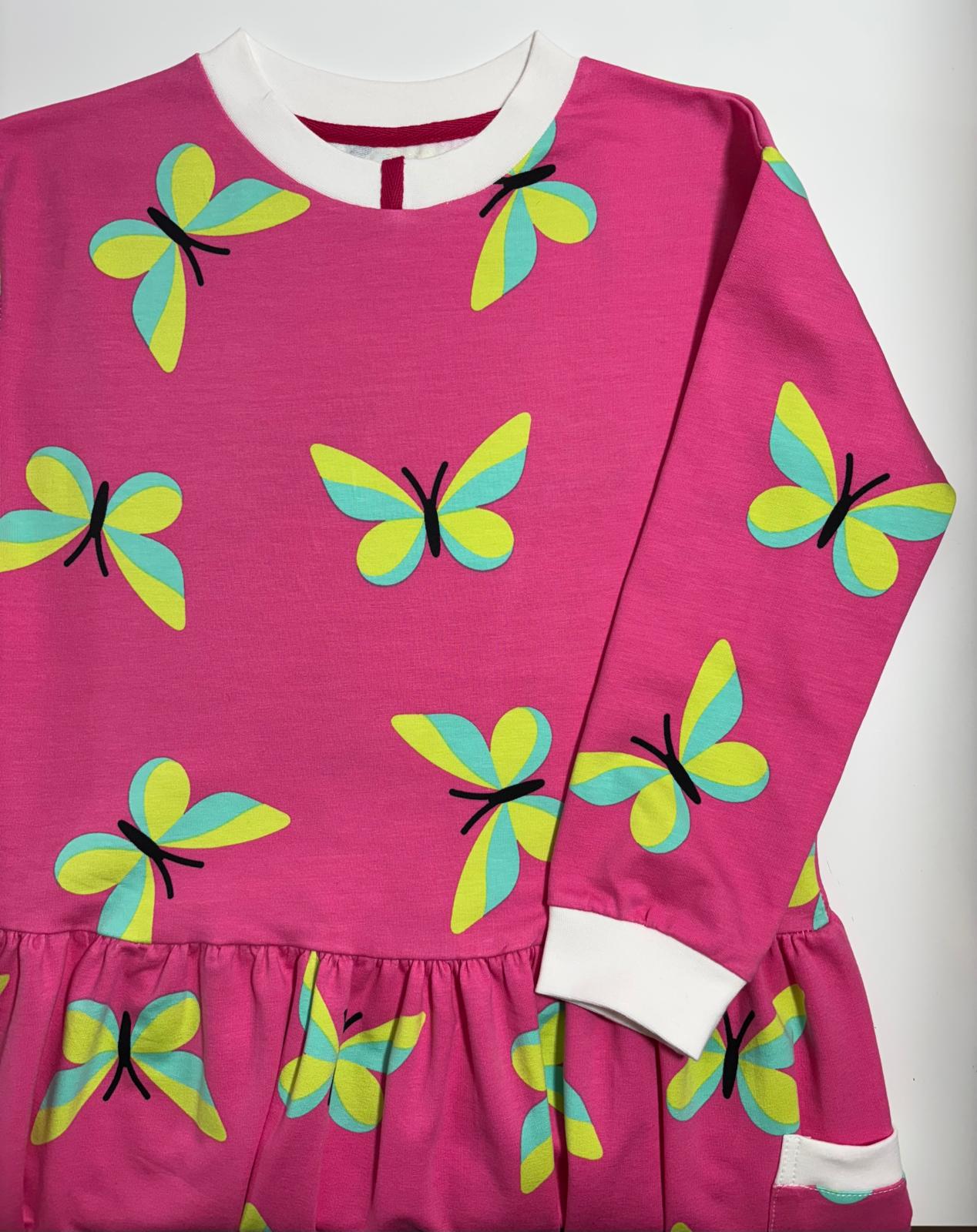 Denna vackra långärmade klänning är handsydd i mjuk bomullsjersey, perfekt för känslig hud. Det färgstarka blommönstret i lila, rosa, blått och orange gör varje dag lite gladare. Praktiska sidofickor och en snurrvänlig kjol gör den perfekt för både lek och fest.