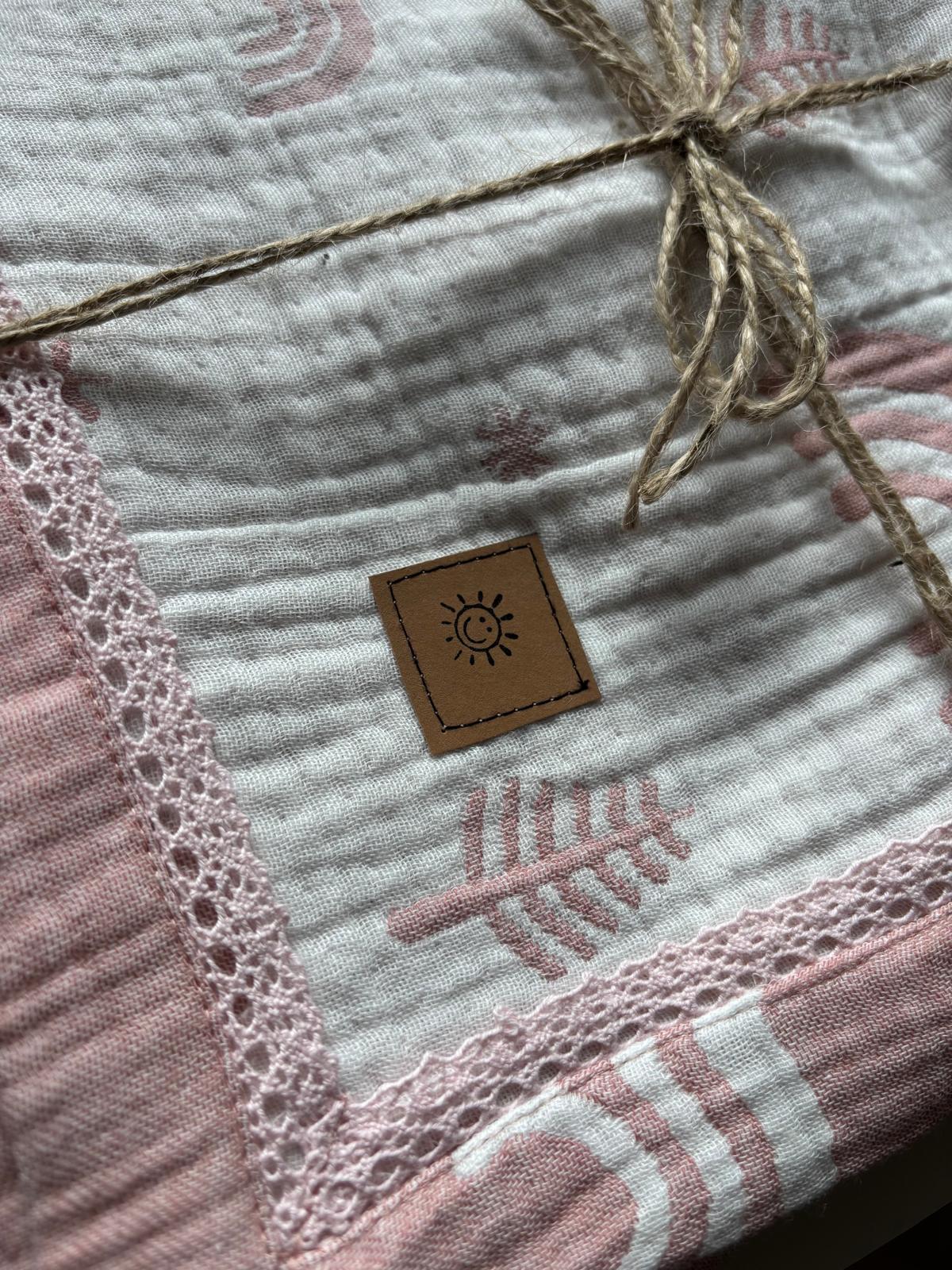 Tillverkad av 4-lagers muslin . Med måtten 100 x 100 cm passar filten perfekt i vagnen, spjälsängen eller som en mysig snuttefilt under vilostunden. (Generellt sett är storlekarna större.)